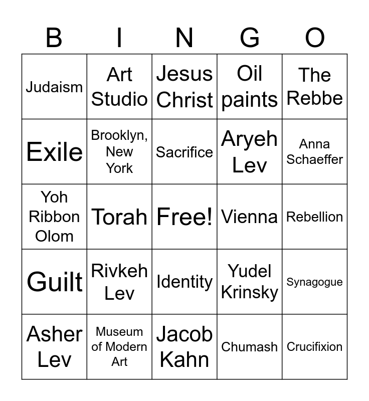 This bingo card has a free space and 24 words: Rivkeh Lev, Museum of Modern Art, Sacrifice, Asher Lev, The Rebbe, Judaism, Exile, Art Studio, Vienna, Identity, Aryeh Lev, Yoh Ribbon Olom, Yudel Krinsky, Synagogue, Brooklyn, New York, Chumash, Rebellion, Jesus Christ, Anna Schaeffer, Torah, Crucifixion, Guilt, Oil paints and Jacob Kahn.
