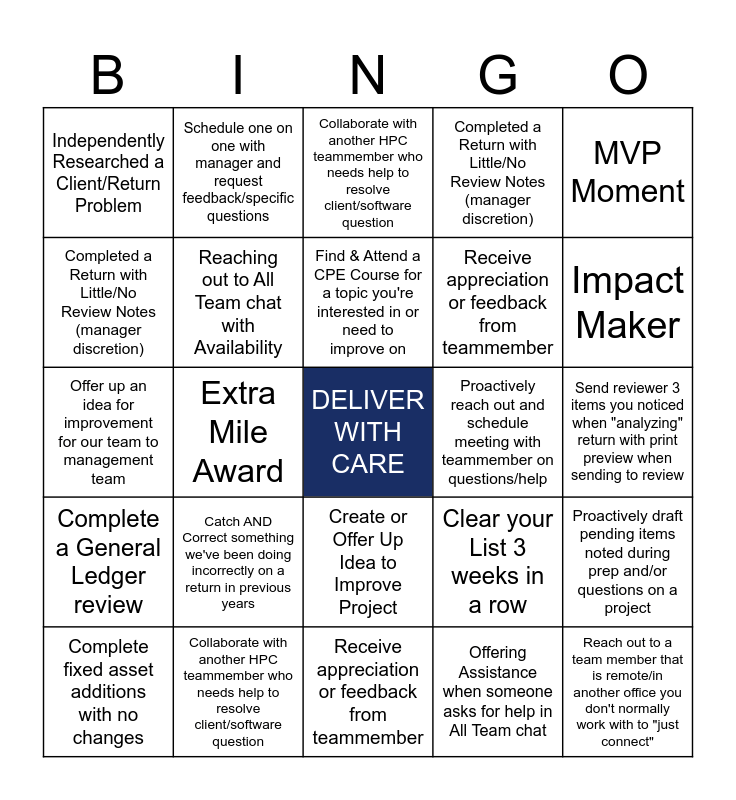This bingo card has a free space and 27 words: Clear your List 3 weeks in a row, MVP Moment, Receive appreciation or feedback from teammember, Receive appreciation or feedback from teammember, Completed a Return with Little/No Review Notes (manager discretion), Collaborate with another HPC teammember who needs help to resolve client/software question, Schedule one on one with manager and request feedback/specific questions, Complete a General Ledger review, Proactively reach out and schedule meeting with teammember on questions/help, Proactively draft pending items noted during prep and/or questions on a project, Offer up an idea for improvement for our team to management team, Completed a Return with Little/No Review Notes (manager discretion), Complete fixed asset additions with no changes, Collaborate with another HPC teammember who needs help to resolve client/software question, Impact Maker, Show major improvement on similar type of return from previous (manager discretion), Reaching out to All Team chat with Availability, Find & Attend a CPE Course for a topic you're interested in or need to improve on, Catch AND Correct something we've been doing incorrectly on a return in previous years, Independently Researched a Client/Return Problem, Send reviewer 3 items you noticed when "analyzing" return with print preview when sending to review, Offering Assistance when someone asks for help in All Team chat, Extra Mile Award, Reach out to a team member that is remote/in another office you don't normally work with to "just connect", Create or Offer Up Idea to Improve Project, MVP Moment and Impact Maker.