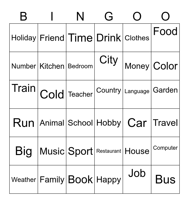 This bingo card has 36 words: Restaurant, Sport, Happy, Number, Run, Country, Kitchen, Book, Clothes, House, Color, Drink, Computer, Cold, City, Holiday, Big, Language, Train, Time, Teacher, Animal, Hobby, School, Car, Friend, Money, Family, Bedroom, Food, Bus, Weather, Travel, Garden, Music and Job.