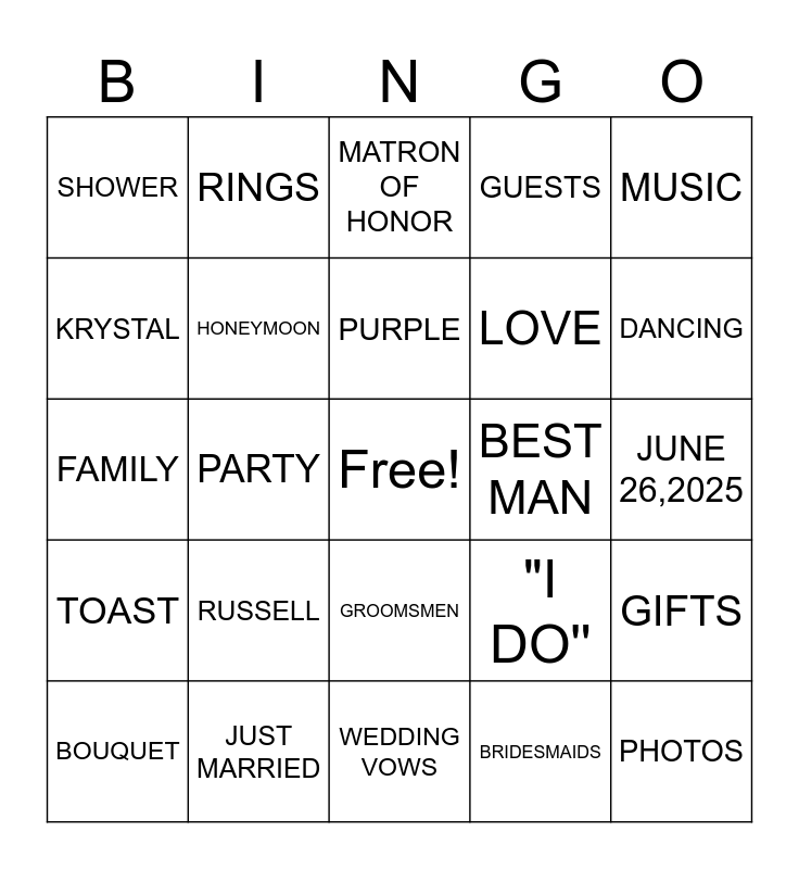 This bingo card has a free space and 24 words: RUSSELL, JUST MARRIED, PURPLE, BOUQUET, MUSIC, SHOWER, KRYSTAL, RINGS, BEST MAN, GROOMSMEN, LOVE, FAMILY, "I DO'', GIFTS, HONEYMOON, BRIDESMAIDS, JUNE 26,2025, MATRON OF HONOR, DANCING, PARTY, PHOTOS, TOAST, GUESTS and WEDDING VOWS.