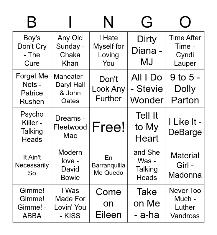 This bingo card has a free space and 29 words: Running Up That Hill, I Was Made For Lovin' You - KISS, I Hate Myself for Loving You, I Wanna Dance With Somebody, Time After Time - Cyndi Lauper, Boy's Don't Cry - The Cure, Maneater - Daryl Hall & John Oates, Don't Look Any Further, Tell It to My Heart, Material Girl - Madonna, Gimme! Gimme! Gimme! - ABBA, Dreams - Fleetwood Mac, Take on Me - a-ha, Never Too Much - Luther Vandross, Psycho Killer - Talking Heads, Call Me- Blondie, Come on Eileen, and She Was - Talking Heads, 9 to 5 - Dolly Parton, It Ain't Necessarily So, Modern love - David Bowie, Heart of Glass - Blondie, All I Do - Stevie Wonder, I Like It - DeBarge, Forget Me Nots - Patrice Rushen, Any Old Sunday - Chaka Khan, En Barranquilla Me Quedo, Dirty Diana - MJ and Human Nature - MJ.