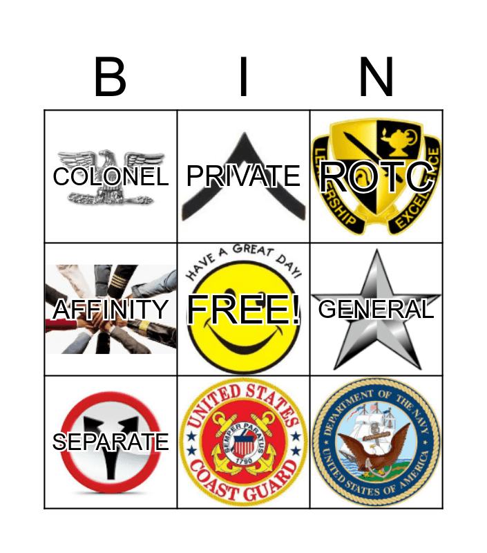 This bingo card has 24 images, a free space and 19 words: COLONEL, GENERAL, PRIVATE, ENSIGN, MAJOR, WARRANT OFFICER, PCS, MILITARY HOUSING, DEPLOY, SEPARATE, RETIRE, SCRA, ROTC, SERGEANT, PETTY OFFICER, AIRMAN, RESERVE, AFFINITY and POA.