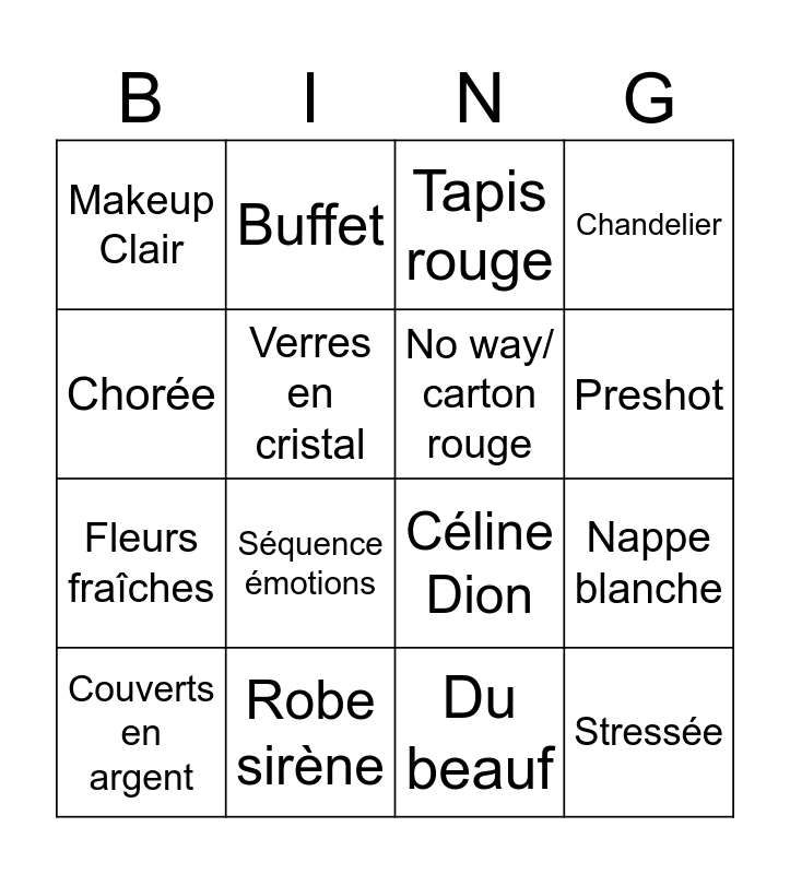 This bingo card has 16 words: Robe sirène, Nappe blanche, Tapis rouge, Makeup Clair, Fleurs fraîches, Buffet, Céline Dion, Du beauf, Chorée, Verres en cristal, Couverts en argent, Chandelier, Séquence émotions, Preshot, No way/ carton rouge and Stressée.
