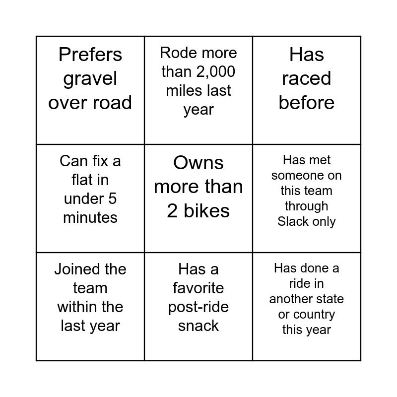 This bingo card has 9 words: Joined the team within the last year, Has raced before, Rode more than 2,000 miles last year, Can fix a flat in under 5 minutes, Prefers gravel over road, Has met someone on this team through Slack only, Owns more than 2 bikes, Has done a ride in another state or country this year and Has a favorite post-ride snack.