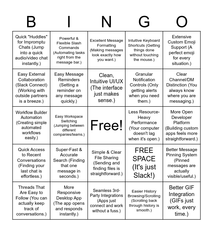 This bingo card has a free space and 25 words: Super-Fast & Accurate Search (Finding that one message in seconds.), Seamless 3rd-Party Integrations (Apps just connect and work without a fuss.), Clean, Intuitive UI/UX (The interface just makes sense.), Threads That Are Easy to Follow (You can actually keep track of conversations.), Extensive Custom Emoji Support (A perfect emoji for every situation.), Quick "Huddles" for Impromptu Chats (Jump into a quick audio/video chat instantly.), Easy External Collaboration (Slack Connect) (Working with outside partners is a breeze.), Powerful & Flexible Slash Commands (Automating tasks right from the message bar.), Less Resource-Heavy Performance (Your computer doesn't lag when it's open.), Simple & Clear File Sharing (Sending and finding files is straightforward.), Granular Notification Controls (Only getting alerts when you need them.), Workflow Builder Automation (Creating simple automated workflows easily.), FREE SPACE (It's just Slack!), Better Message Pinning System (Pinned messages are actually visible/useful.), Easy Message Reminders (Setting a reminder on any message quickly.), Send Quick Video/Audio "Clips" (Sharing a quick thought without typing.), More Open Developer Platform (Building custom apps feels more straightforward.), Excellent Message Formatting (Making messages look exactly how you want.), Clear Channel/DM Distinction (You always know where you are messaging.), Easy Workspace Switching (Jumping between different companies/teams.), Better GIF Integration (GIFs just work, every time.), More Responsive Desktop App (The app opens and responds instantly.), Quick Access to Recent Conversations (Finding your last chat is effortless.), Intuitive Keyboard Shortcuts (Getting things done without touching the mouse.) and Easier History Browsing/Scrolling (Scrolling back through history is smooth.).