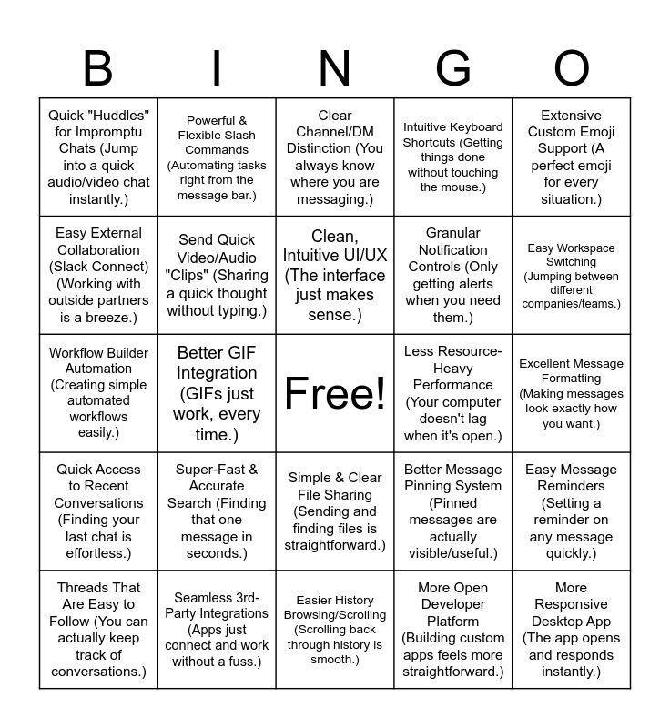 This bingo card has a free space and 24 words: Super-Fast & Accurate Search (Finding that one message in seconds.), Seamless 3rd-Party Integrations (Apps just connect and work without a fuss.), Clean, Intuitive UI/UX (The interface just makes sense.), Threads That Are Easy to Follow (You can actually keep track of conversations.), Extensive Custom Emoji Support (A perfect emoji for every situation.), Quick "Huddles" for Impromptu Chats (Jump into a quick audio/video chat instantly.), Easy External Collaboration (Slack Connect) (Working with outside partners is a breeze.), Powerful & Flexible Slash Commands (Automating tasks right from the message bar.), Less Resource-Heavy Performance (Your computer doesn't lag when it's open.), Simple & Clear File Sharing (Sending and finding files is straightforward.), Granular Notification Controls (Only getting alerts when you need them.), Workflow Builder Automation (Creating simple automated workflows easily.), Better Message Pinning System (Pinned messages are actually visible/useful.), Easy Message Reminders (Setting a reminder on any message quickly.), Send Quick Video/Audio "Clips" (Sharing a quick thought without typing.), More Open Developer Platform (Building custom apps feels more straightforward.), Excellent Message Formatting (Making messages look exactly how you want.), Clear Channel/DM Distinction (You always know where you are messaging.), Easy Workspace Switching (Jumping between different companies/teams.), Better GIF Integration (GIFs just work, every time.), More Responsive Desktop App (The app opens and responds instantly.), Quick Access to Recent Conversations (Finding your last chat is effortless.), Intuitive Keyboard Shortcuts (Getting things done without touching the mouse.) and Easier History Browsing/Scrolling (Scrolling back through history is smooth.).