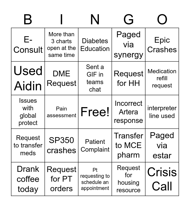 This bingo card has a free space and 30 words: Request for PT orders, Inappropriate transfer, Pain assessment, Request for OTC recommendation, E-Consult, Diabetes Education, DME Request, Patient Complaint, Incorrect Artera response, Pt requesting to schedule an appointment, interpreter line used, Crisis Call, Request for housing resource, Request for work excuse, Medication refill request, Same day surgery call back, Transfer to MCE pharm, Request to transfer meds, SP350 crashes, Epic Crashes, Issues with global protect, Call lasts for more than 10 minutes, More than 3 charts open at the same time, Request for HH, Used Aidin, Paged via synergy, Paged via estar, Drank coffee today, Sent a GIF in teams chat and Recommended ED.