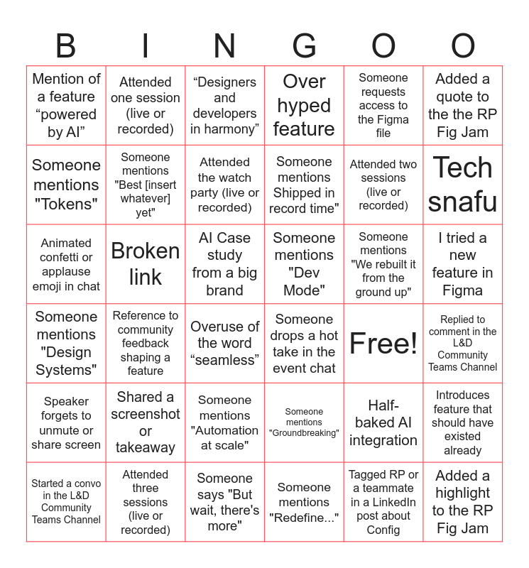 This bingo card has 36 words: Someone mentions "Groundbreaking", Someone mentions "Automation at scale", Someone mentions "Redefine...", Someone mentions "Tokens", Someone mentions "Design Systems", Someone mentions "Dev Mode", Someone mentions "Best [insert whatever] yet", Someone says "But wait, there's more", Someone requests access to the Figma file, Half-baked AI integration, Tech snafu, Over hyped feature, Introduces feature that should have existed already, Broken link, Someone mentions Shipped in record time", Mention of a feature “powered by AI”, Speaker forgets to unmute or share screen, Someone mentions "We rebuilt it from the ground up", Animated confetti or applause emoji in chat, “Designers and developers in harmony”, AI Case study from a big brand, Reference to community feedback shaping a feature, Someone drops a hot take in the event chat, Overuse of the word “seamless”, Free!, Attended one session (live or recorded), Attended two sessions (live or recorded), Attended three sessions (live or recorded), Attended the watch party (live or recorded), Added a quote to the the RP Fig Jam, Added a highlight to the RP Fig Jam, Started a convo in the L&D Community Teams Channel, Replied to comment in the L&D Community Teams Channel, I tried a new feature in Figma, Shared a screenshot or takeaway and Tagged RP or a teammate in a LinkedIn post about Config.