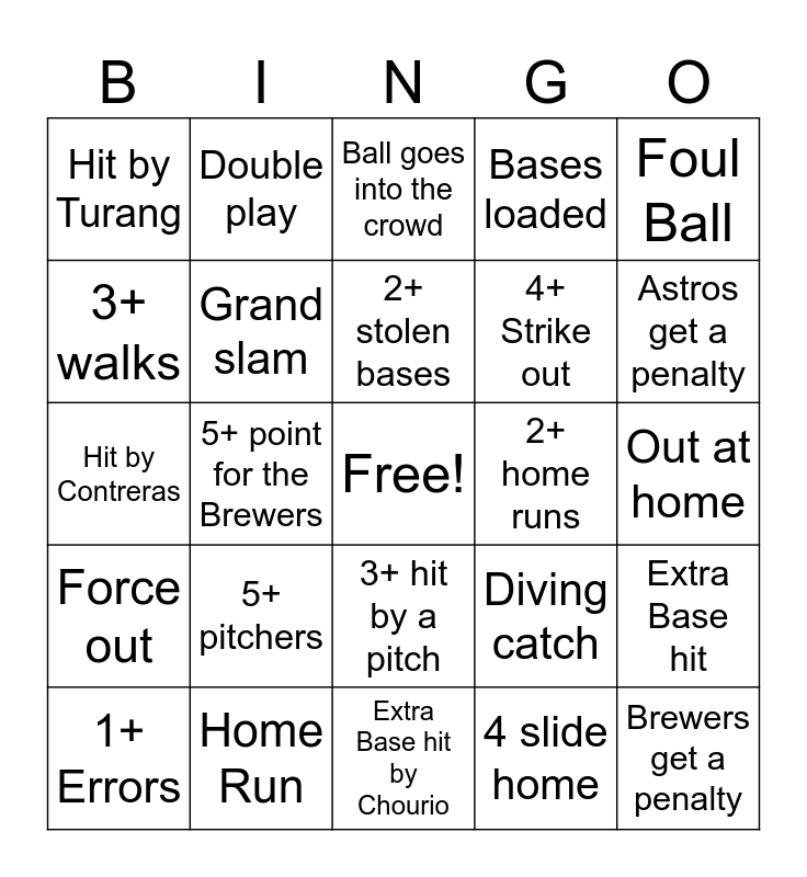 This bingo card has a free space and 24 words: 5+ pitchers, Home Run, 2+ stolen bases, 1+ Errors, Foul Ball, Hit by Turang, 3+ walks, Double play, 2+ home runs, 3+ hit by a pitch, 4+ Strike out, Hit by Contreras, Diving catch, Extra Base hit, Grand slam, 4 slide home, Out at home, Ball goes into the crowd, Astros get a penalty, 5+ point for the Brewers, Brewers get a penalty, Force out, Bases loaded and Extra Base hit by Chourio.