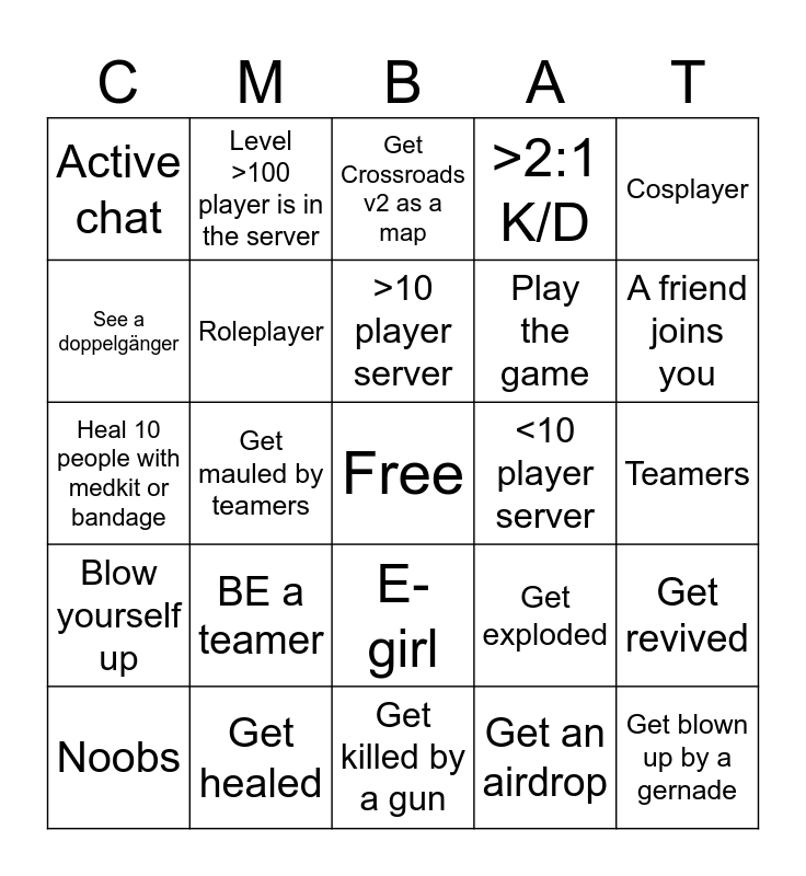 This bingo card has a free space and 34 words: Brain rotted player, Get an airdrop, Have a chat with a stranger, Get someone to kamikaze using C4 that you threw on them, Blow yourself up, Roleplayer, Cosplayer, Noobs, Level >100 player is in the server, >1:1 K/D, >10 player server, Get Crossroads v2 as a map, Have a chat with someone, 5 killstreak, <10 player server, A friend joins you, Get healed, Heal 10 people with medkit or bandage, BE a teamer, Get exploded, E-girl, Full Server, Active chat, Teamers, Get killed by a gun, Get blown up by a gernade, >2:1 K/D, Make a new friend, Play the game, See a doppelgänger, Embarrass yourself, Get mauled by teamers, Get revived and Be carried by somebody.