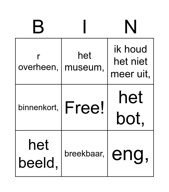 This bingo card has a free space and 35 words: anraken,, afscheid nemen,, het album,, het beeld,, beslissen,, binnenkort,, het bot,, bovenin,, breekbaar,, dadelijk,, de dino,, eng,, enthousiast,, er onderdoor,, r overheen,, ergens opkomen,, gapen,, glijden,, heen en weer,, het eens zijn met,, hoog-hoger-het hoogst,, het oudst, het idee,, iets buigen,, iets dubbel hebben,, ik houd het niet meer uit,, interessant,, kneden,, de kunstenaar,, het kunstwerk,, lenig,, de lijst,, met open mond kijken,, modern,, het museum, and de natuur..