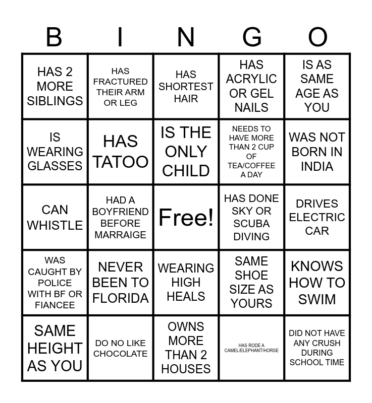 This bingo card has a free space and 35 words: IS LEFT HANDED, IS WEARING BELT, IS WEARING GREEN, HAS TATOO, WEARING HIGH HEALS, HAS ACRYLIC OR GEL NAILS, IS WEARING GLASSES, IS OLDER THAN YOU, IS THE ONLY CHILD, NAME STARTS WITH SAME LETTER AS YOU, CAN WHISTLE, IS AS SAME AGE AS YOU, DOESN'T DRINK TEA AND COFFEE, IS WEARING CONTACTS, HAS 2 MORE SIBLINGS, HAS DONE SKY OR SCUBA DIVING, HAS RODE A CAMEL/ELEPHANT/HORSE, HAD A BOYFRIEND BEFORE MARRAIGE, WAS CAUGHT BY POLICE WITH BF OR FIANCEE, DID NOT HAVE ANY CRUSH DURING SCHOOL TIME, SAME SHOE SIZE AS YOURS, SAME HEIGHT AS YOU, KNOWS HOW TO SWIM, DO NO LIKE CHOCOLATE, HAS SHORTEST HAIR, WAS NOT BORN IN INDIA, HAS CURLY HAIR, HAVE PHONE OTHER THAN IPHONE OR SAMSUNG, NEEDS TO HAVE MORE THAN 2 CUP OF TEA/COFFEE A DAY, DRIVES ELECTRIC CAR, FAN OF KOREAN POP, OWNS MORE THAN 2 HOUSES, NEVER BEEN TO FLORIDA, HAS FRACTURED THEIR ARM OR LEG and HAS LONGEST HAIR.