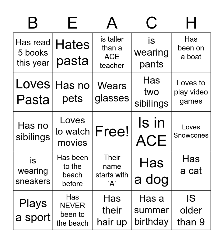 This bingo card has a free space and 24 words: Has been to the beach before, Has NEVER been to the beach, Wears glasses, Plays a sport, Has been on a boat, Has read 5 books this year, Loves Pasta, Hates pasta, Is in ACE, Their name starts with 'A', Has two sibilings, Has no sibilings, Has a dog, Has a cat, Has no pets, Has a summer birthday, Loves Snowcones, is taller than a ACE teacher, Loves to play video games, Loves to watch movies, IS older than 9, is wearing sneakers, is wearing pants and Has their hair up.