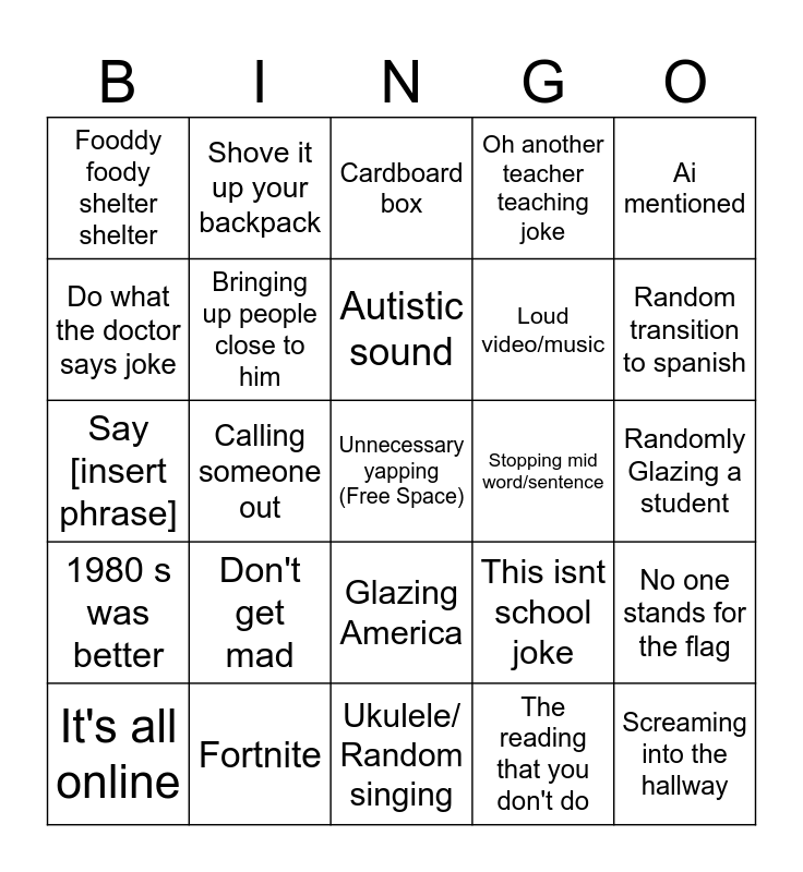 This bingo card has a free space and 33 words: Itsa a school, Show up on time, get a job, be happy, Calling someone out, Gamma boys, 1980 s was better, Bringing up people close to him, Ai mentioned, It's all online, Shove it up your backpack, Phone=drug, Autistic sound, Cardboard box, Wierd phone comments, Am I funny/is my joke funny, Stopping mid word/sentence, Random transition to spanish, Fortnite, Say [insert phrase], Don't get mad, This isnt school joke, Glazing America, Randomly mentioning racism, Fooddy foody shelter shelter, Randomly Glazing a student, Ukulele/ Random singing, Screaming into the hallway, Oh another teacher teaching joke, Loud video/music, Do what the doctor says joke, No one stands for the flag, Randomly r Mentioning rape, The reading that you don't do and Mentioning his childhood.