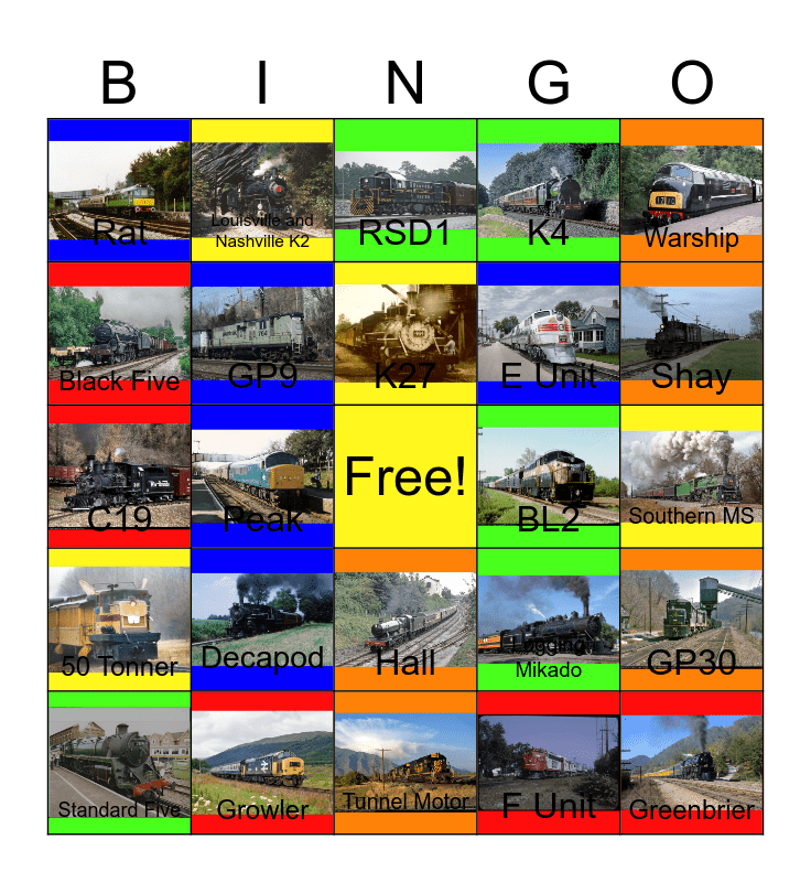 This bingo card has 24 images, a free space and 24 words: Decapod, Growler, K27, Standard Five, Warship, Rat, Black Five, Louisville and Nashville K2, BL2, Hall, E Unit, C19, Logging Mikado, GP30, GP9, F Unit, Southern MS, RSD1, Shay, Peak, Greenbrier, 50 Tonner, K4 and Tunnel Motor.