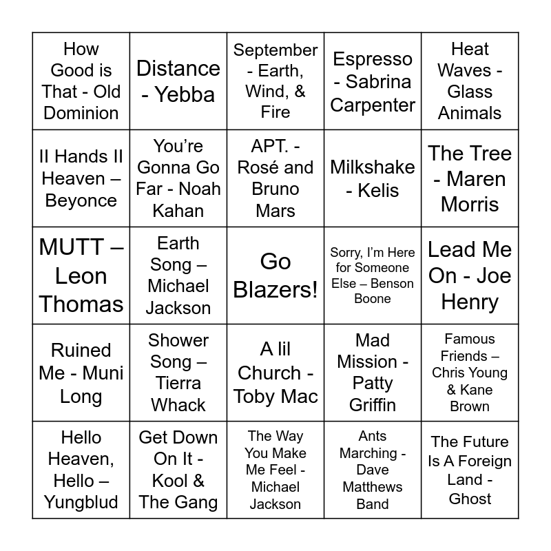 This bingo card has a free space and 26 words: A lil Church - Toby Mac, Ants Marching - Dave Matthews Band, APT. - Rosé and Bruno Mars, Get Down On It - Kool & The Gang, Heat Waves - Glass Animals, How Good is That - Old Dominion, II Hands II Heaven – Beyonce, Distance - Yebba, Lead Me On - Joe Henry, Mad Mission - Patty Griffin, Milkshake - Kelis, MUTT – Leon Thomas, Famous Friends – Chris Young & Kane Brown, Hello Heaven, Hello – Yungblud, Earth Song – Michael Jackson, Alabama Haint – Penny & Sparrow, Espresso - Sabrina Carpenter, Ruined Me - Muni Long, September - Earth, Wind, & Fire, The Future Is A Foreign Land - Ghost, The Tree - Maren Morris, The Way You Make Me Feel - Michael Jackson, Sorry, I’m Here for Someone Else – Benson Boone, Shower Song – Tierra Whack, You’re Gonna Go Far - Noah Kahan and You’ve Got The Right Stuff - New Kids on the Block.