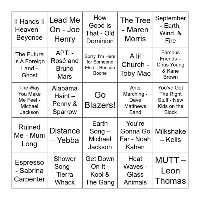 This bingo card has a free space and 26 words: Earth Song – Michael Jackson, Heat Waves - Glass Animals, Sorry, I’m Here for Someone Else – Benson Boone, Shower Song – Tierra Whack, September - Earth, Wind, & Fire, II Hands II Heaven – Beyonce, The Future Is A Foreign Land - Ghost, Lead Me On - Joe Henry, You’ve Got The Right Stuff - New Kids on the Block, You’re Gonna Go Far - Noah Kahan, A lil Church - Toby Mac, The Way You Make Me Feel - Michael Jackson, Milkshake – Kelis, Espresso - Sabrina Carpenter, Alabama Haint – Penny & Sparrow, Mad Mission - Patty Griffin, The Tree - Maren Morris, Ruined Me - Muni Long, How Good is That - Old Dominion, MUTT – Leon Thomas, Famous Friends – Chris Young & Kane Brown, Get Down On It - Kool & The Gang, Ants Marching - Dave Matthews Band, Distance – Yebba, APT. - Rosé and Bruno Mars and Hello Heaven, Hello – Yungblud.