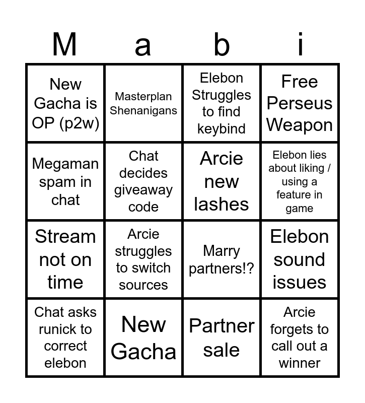 This bingo card has 20 words: Elebon sound issues, Elebon new Haircut, Elebon Struggles to find keybind, Elebon struggles to read, Chat asks runick to correct elebon, Megaman spam in chat, New Gacha, New Gacha is OP (p2w), Stream not on time, Masterplan Shenanigans, Arcie struggles to switch sources, Marry partners!?, Chat decides giveaway code, Arcie forgets to call out a winner, Arcie new lashes, Arcie and Elebon read post instead of presenting, Elebon lies about liking / using a feature in game, Free Perseus Weapon, Partner sale and Old soulstreamer wins giveaway.