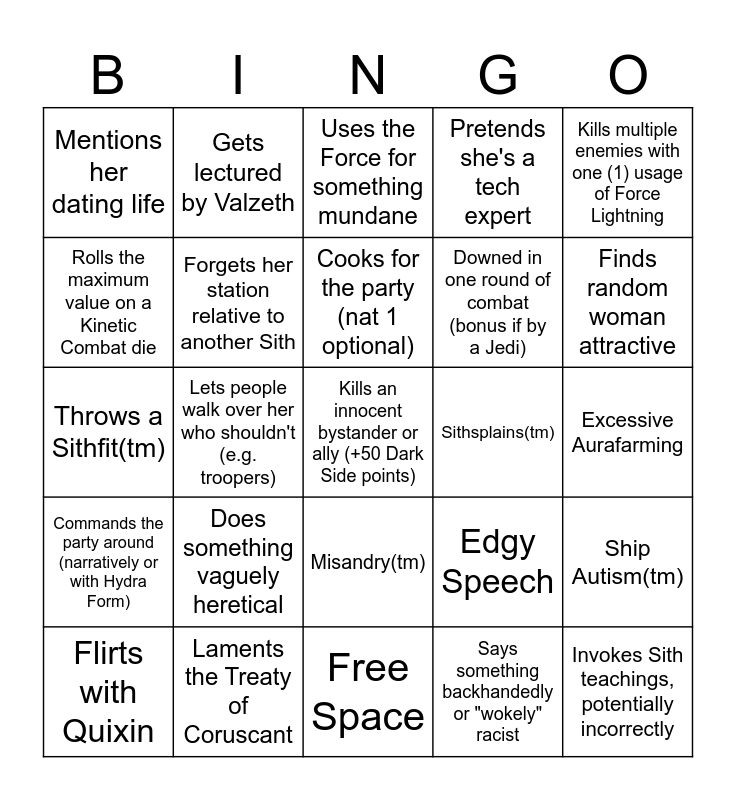 This bingo card has 25 words: Commands the party around (narratively or with Hydra Form), Laments the Treaty of Coruscant, Kills an innocent bystander or ally (+50 Dark Side points), Says something backhandedly or "wokely" racist, Kills multiple enemies with one (1) usage of Force Lightning, Mentions her dating life, Gets lectured by Valzeth, Uses the Force for something mundane, Sithsplains(tm), Ship Autism(tm), Rolls the maximum value on a Kinetic Combat die, Forgets her station relative to another Sith, Free Space, Edgy Speech, Finds random woman attractive, Flirts with Quixin, Lets people walk over her who shouldn't (e.g. troopers), Cooks for the party (nat 1 optional), Downed in one round of combat (bonus if by a Jedi), Excessive Aurafarming, Throws a Sithfit(tm), Does something vaguely heretical, Misandry(tm), Pretends she's a tech expert and Invokes Sith teachings, potentially incorrectly.
