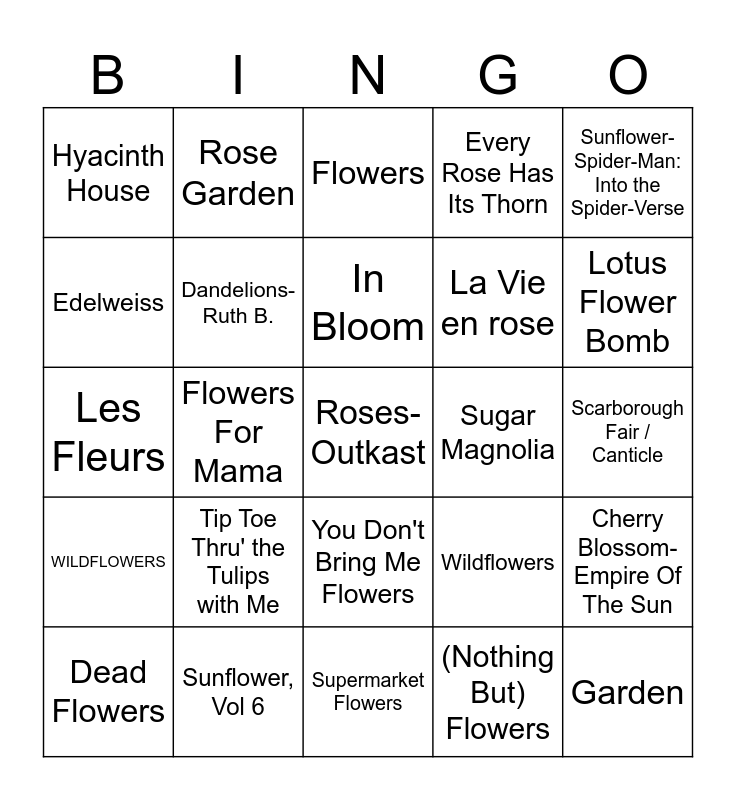 This bingo card has 45 words: Kiss From a Rose, Roses- Outkast, Roses-The Chainsmokers, Dead Flowers, Build Me up Buttercup, (Nothing But) Flowers, Flowers, Flowers In Your Hair, Sunflower- Spider-Man: Into the Spider-Verse, Sunflower, Vol 6, Every Rose Has Its Thorn, Sugar Magnolia, You Don't Bring Me Flowers, Tip Toe Thru' the Tulips with Me, Blue Orchid, Supermarket Flowers, Daises, Les Fleurs, Lotus Flower, Lotus Flower Bomb, Rose Garden, Delta Dawn, Roses/Lotus/ /Violet/Iris, Hyacinth House, Paper Roses, Scarborough Fair / Canticle, Virginia Bluebell, Life Is A Flower, Wildflowers, WILDFLOWERS, cherry blossom- Kacey Musgraves, Cherry Blossom- Empire Of The Sun, Roses Are Red (My Love), Crimson & Clover, I Wish you Roses, Flowers For Mama, Fading Like A Flower (Every Time You Leave), San Francisco (Be Sure to Wear Some Flowers in Your Hair), Garden, In Bloom, Edelweiss, La Vie en rose, Iris, Dandelions- Ruth B. and Dandelion- Rolling Stones.