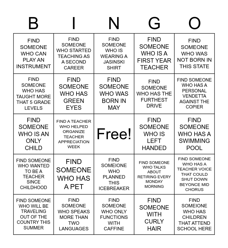 This bingo card has a free space and 24 words: FIND SOMEONE WHO HAS A PET, FIND SOMEONE WHO SPEAKS MORE THAN TWO LANGUAGES, FIND SOMEONE WHO WAS BORN IN MAY, FIND SOMEONE WHO WILL BE TRAVELING OUT OF THE COUNTRY THIS SUMMER, FIND SOMEONE WHO WAS NOT BORN IN THIS STATE, FIND SOMEONE WHO CAN PLAY AN INSTRUMENT, FIND SOMEONE WHO HAS TAUGHT MORE THAT 5 GRADE LEVELS, FIND SOMEONE WHO STARTED TEACHING AS A SECOND CAREER, FIND SOMEONE WHO IS LEFT HANDED, FIND SOMEIONE WHO PLANNED THIS ICEBREAKER, FIND SOMEONE WHO HAS THE FURTHEST DRIVE, FIND SOMEONE WHO IS AN ONLY CHILD, FIND SOMEONE WHO TALKS ABOUT RETIRING EVERY MONDAY MORNING, FIND SOMEONE WHO HAS A TEACHER VOICE THAT COULD SHUT DOWN BEYONCE MID CHORUS, FIND SOMEONE WHO HAS GREEN EYES, FIND SOMEONE WITH CURLY HAIR, FIND SOMEONE WHO HAS A SWIMMING POOL, FIND SOMEONE WHO IS WEARING A JASINSKI SHIRT, FIND SOMEONE WHO HAS A PERSONAL VENDETTA AGAINST THE COPIER, FIND A TEACHER WHO HELPED ORGANIZE TEACHER APPRECIATION WEEK, FIND SOMEIONE WHO HAS CHILDREN THAT ATTEND SCHOOL HERE, FIND SOMEONE WHO WANTED TO BE A TEACHER SINCE CHILDHOOD, FIND SOMEONE WHO IS A FIRST YEAR TEACHER and FIND SOMEONE WHO ONLY FUNCTIONS WITH CAFFINE.