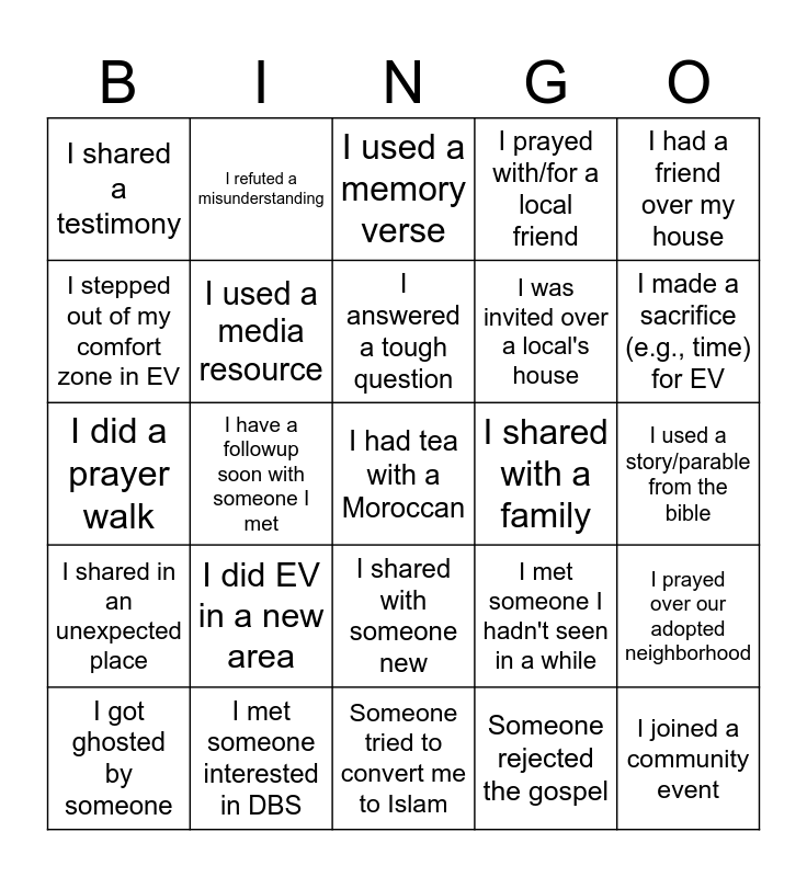 This bingo card has a free space and 24 words: I did EV in a new area, I met someone interested in DBS, I answered a tough question, I got ghosted by someone, I had a friend over my house, I shared a testimony, I stepped out of my comfort zone in EV, I refuted a misunderstanding, I shared with a family, I shared with someone new, I was invited over a local's house, I did a prayer walk, I met someone I hadn't seen in a while, I prayed over our adopted neighborhood, I used a media resource, Someone rejected the gospel, I used a story/parable from the bible, I used a memory verse, I made a sacrifice (e.g., time) for EV, I have a followup soon with someone I met, I joined a community event, I shared in an unexpected place, I prayed with/for a local friend and Someone tried to convert me to Islam.