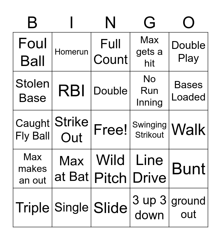 This bingo card has a free space and 24 words: Max at Bat, Single, Double, Triple, Double Play, Foul Ball, Stolen Base, Homerun, Swinging Strikout, Wild Pitch, No Run Inning, Caught Fly Ball, Line Drive, Bunt, RBI, 3 up 3 down, Walk, Full Count, Bases Loaded, Strike Out, ground out, Max makes an out, Max gets a hit and Slide.