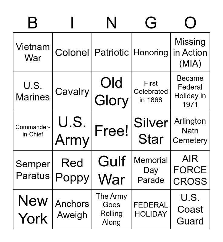 This bingo card has a free space and 75 words: Memorial Day, Americana, Patriotic, Salute, Fallen Heroes, Star Spangled Banner, Stars & Stripes, Semper Fi, Land of the Free, Home of the Brave, Tomb of the Unknown Soldier, Veteran, Old Glory, U.S. Marines, U.S. Navy, U.S. Army, U.S. Air Force, U.S. Coast Guard, U.S. Space Force, Missing in Action (MIA), Battalion, Commander-in-Chief, Cavalry, Colonel, Honoring, Remembrance, Ultimate Sacrifice, LAST MONDAY of MAY, LET FREEDOM RING, PRISONER of WAR (POW), AMERICAN FLAG, COMMEMORATE, Originally called "Decoration Day", Memorial Day Parade, Became Federal Holiday in 1971, First Celebrated in 1868, Originally May 30th, Natn. Moment of Remembrance 3pm, Arlington Natn Cemetery, FEDERAL HOLIDAY, VFW, World War I, World War II, Civil War, Gettysburg Address, Mexican-American War, New York, Vietnam War, Korean War, Spanish-American War, War on Terror, Gulf War, American Revolutionary War, War of 1812, Military Cemetery, John A. Logan, Waterloo, NY, Family Gatherings, Laying Wreaths, Flags at Half-Staff, Red Poppy, Liberty, TAPS, Hot Dogs, Medal of Honor, Silver Star, Awards of Valor, Distinguished Service Cross, NAVY CROSS, AIR FORCE CROSS, Semper Paratus, Anchors Aweigh, The Halls of Montezuma, The Army Goes Rolling Along and Wild Blue Yonder.
