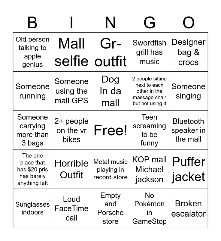 This bingo card has a free space and 24 words: Horrible Outfit, Loud FaceTime call, Dog In da mall, Sunglasses indoors, Designer bag & crocs, Old person talking to apple genius, Someone running, Mall selfie, Teen screaming to be funny, Metal music playing in record store, 2 people sitting next to each other in the massage chair but not using it, Someone carrying more than 3 bags, KOP mall Michael jackson, Puffer jacket, Someone using the mall GPS, No Pokémon in GameStop, Bluetooth speaker in the mall, Gr-outfit, Someone singing, 2+ people on the vr bikes, Broken escalator, The one place that has $20 pris has barely anything left, Swordfish grill has music and Empty and Porsche store.