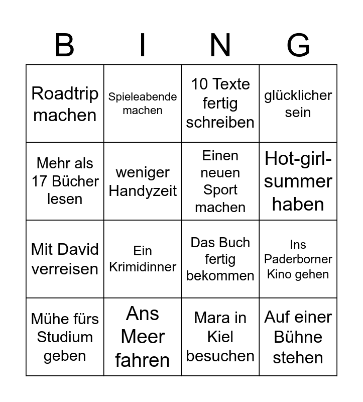 This bingo card has 16 words: Mühe fürs Studium geben, Ans Meer fahren, 10 Texte fertig schreiben, glücklicher sein, Mehr als 17 Bücher lesen, Spieleabende machen, Das Buch fertig bekommen, Ins Paderborner Kino gehen, Roadtrip machen, weniger Handyzeit, Mara in Kiel besuchen, Hot-girl-summer haben, Mit David verreisen, Ein Krimidinner, Einen neuen Sport machen and Auf einer Bühne stehen.