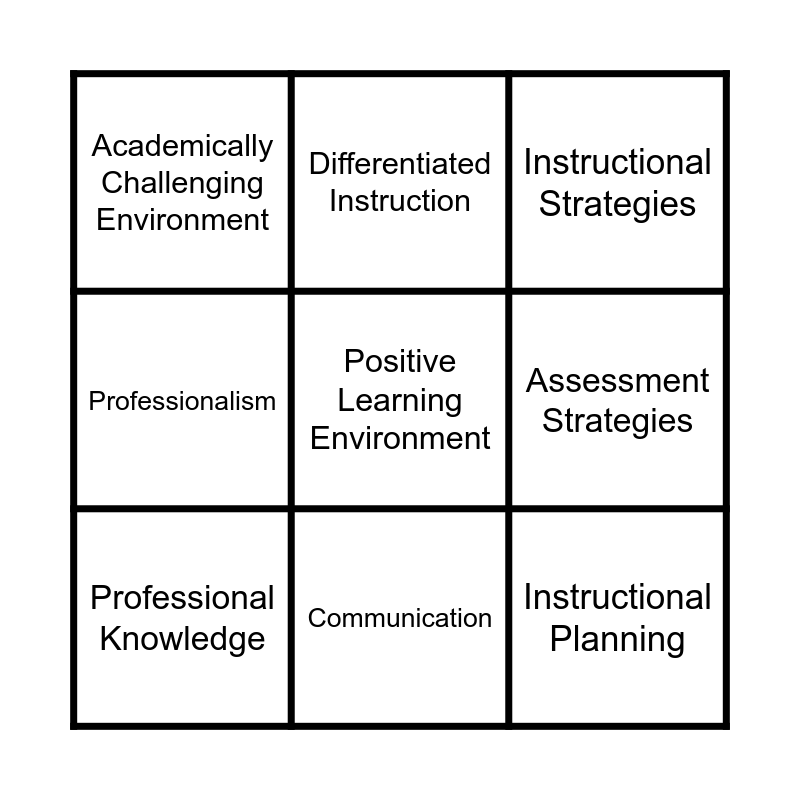 This bingo card has a free space and 9 words: Professional Knowledge, Instructional Strategies, Differentiated Instruction, Professionalism, Academically Challenging Environment, Assessment Strategies, Instructional Planning, Assessment Uses and Communication.
