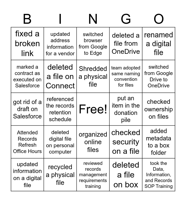This bingo card has a free space and 24 words: deleted digital file on personal computer, recycled a physical file, Shredded a physical file, updated information on a digital file, renamed a digital file, fixed a broken link, marked a contract as executed on Salesforce, updated address information for a vendor, put an item in the donation pile, organized online files, team adopted same naming convention for files, got rid of a draft on Salesforce, checked security on a file, added metadata to a box folder, deleted a file on Connect, deleted a file on box, checked ownership on files, switched browser from Google to Edge, switched from Google Drive to OneDrive, referenced the records retention schedule, took the Data, Information, and Records SOP Training, Attended Records Refresh Office Hours, deleted a file from OneDrive and reviewed records management requirements training.