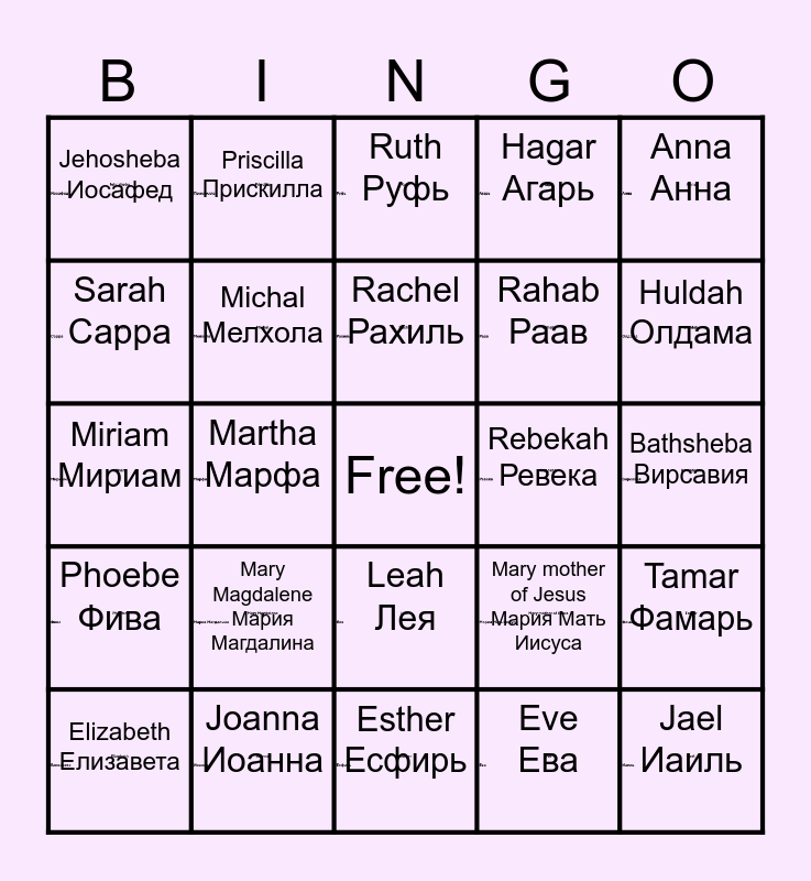 This bingo card has 25 images, a free space and 25 words: Mary Magdalene Мария Магдалина, Esther Есфирь, Rachel Рахиль, Elizabeth Елизавета, Anna Анна, Jehosheba Иосафед, Sarah Сарра, Priscilla Прискилла, Rebekah Ревека, Leah Лея, Rahab Раав, Miriam Мириам, Mary mother of Jesus Мария Мать Иисуса, Tamar Фамарь, Michal Мелхола, Deborah Девора, Bathsheba Вирсавия, Ruth Руфь, Huldah Олдама, Martha Марфа, Jael Иаиль, Joanna Иоанна, Phoebe Фива, Hagar Агарь and Eve Ева.