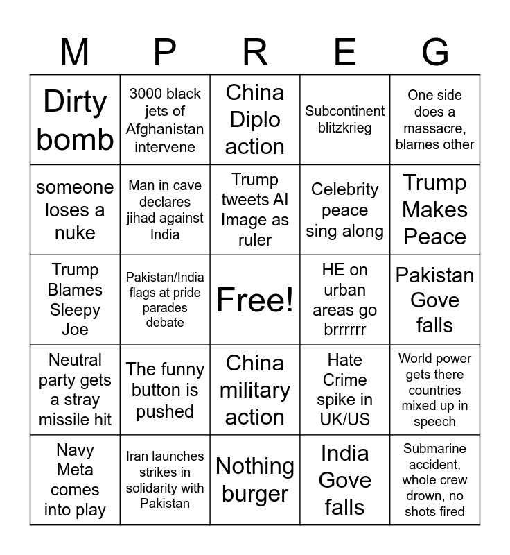 This bingo card has a free space and 24 words: The funny button is pushed, Iran launches strikes in solidarity with Pakistan, Trump tweets AI Image as ruler, Navy Meta comes into play, One side does a massacre, blames other, Dirty bomb, someone loses a nuke, 3000 black jets of Afghanistan intervene, HE on urban areas go brrrrrr, China military action, Celebrity peace sing along, Trump Blames Sleepy Joe, Hate Crime spike in UK/US, World power gets there countries mixed up in speech, Man in cave declares jihad against India, India Gove falls, Pakistan Gove falls, China Diplo action, Trump Makes Peace, Pakistan/India flags at pride parades debate, Submarine accident, whole crew drown, no shots fired, Neutral party gets a stray missile hit, Subcontinent blitzkrieg and Nothing burger.