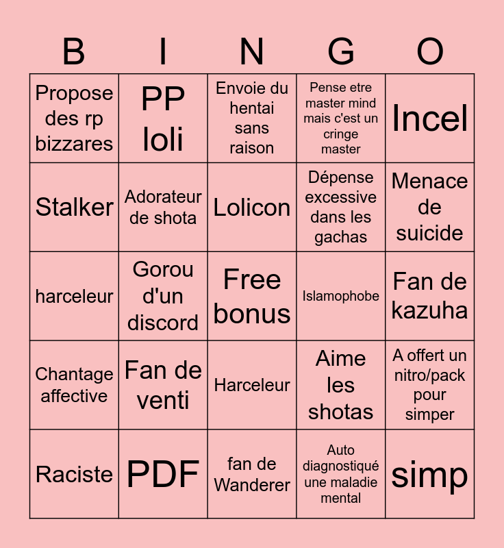 This bingo card has a free space and 24 words: Fan de venti, PDF, Lolicon, Raciste, Incel, Propose des rp bizzares, Stalker, PP loli, Islamophobe, Harceleur, Dépense excessive dans les gachas, harceleur, Aime les shotas, A offert un nitro/pack pour simper, Adorateur de shota, Auto diagnostiqué une maladie mental, Fan de kazuha, Envoie du hentai sans raison, Menace de suicide, Gorou d'un discord, simp, Chantage affective, Pense etre master mind mais c'est un cringe master and fan de Wanderer.