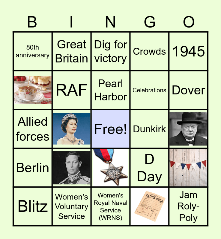 This bingo card has 10 images, a free space and 54 words: 8th May 1945, Bank Holiday, Street Party, World War II, Great Britain, Rations, Pearl Harbor, Victory, Morse Code, 1945, Freedom, 80th anniversary, VE Day, Celebrations, Berlin, Crowds, Veterans, Singalong, Vera Lynn, We'll meet again, National Savings Stamps, Red Arrows, Survival, Heroes, Sacrifice, Dunkirk, Dover, Blitz, Make do and mend, Evacuation, RAF, Allied forces, Dunkirk, Homity Pie, Battle of Britain, Blackouts, Jam Roly-Poly, Women's Voluntary Service, USA, D Day, France, Auxiliary Territorial Service, Women's Auxiliary Air Force (WAAF), Women's Royal Naval Service (WRNS), Keep Calm and Carry on, Victory Rolls, Dig for victory, Enigma Code, Atomic bomb, Gramophone, Gas masks, Women's Timber Corps (WTC), Surrender and Peace.