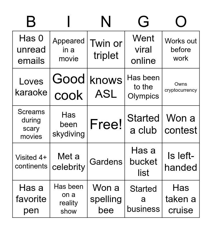This bingo card has a free space and 24 words: Met a celebrity, Has been on a reality show, knows ASL, Has a favorite pen, Works out before work, Has 0 unread emails, Loves karaoke, Appeared in a movie, Started a club, Gardens, Has been to the Olympics, Screams during scary movies, Has a bucket list, Is left-handed, Good cook, Started a business, Won a contest, Twin or triplet, Owns cryptocurrency, Has been skydiving, Has taken a cruise, Visited 4+ continents, Went viral online and Won a spelling bee.