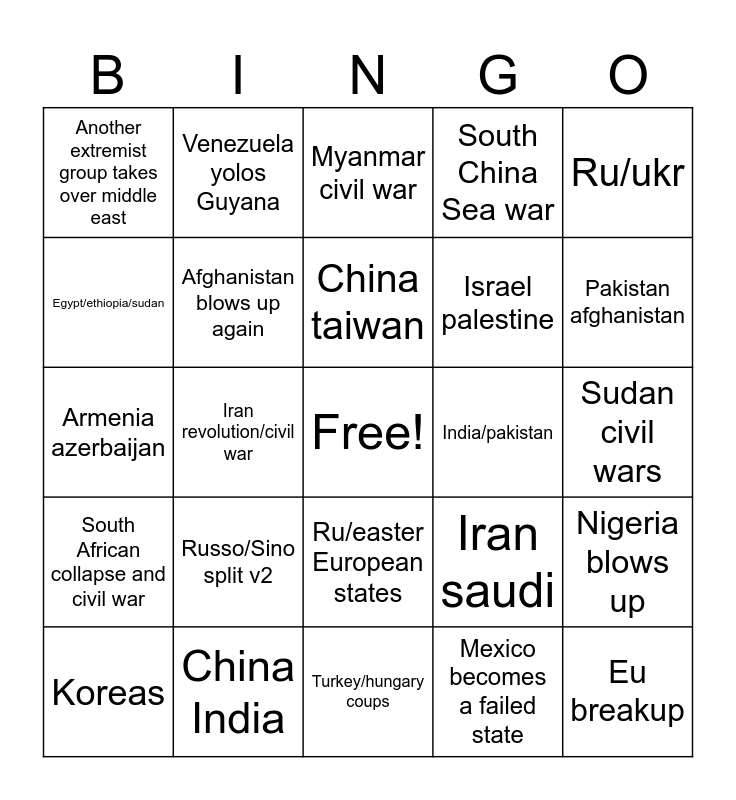 This bingo card has a free space and 24 words: Russo/Sino split v2, China India, China taiwan, Koreas, Ru/ukr, Another extremist group takes over middle east, Egypt/ethiopia/sudan, Venezuela yolos Guyana, India/pakistan, Ru/easter European states, Israel palestine, Armenia azerbaijan, Iran saudi, Nigeria blows up, Afghanistan blows up again, Mexico becomes a failed state, Sudan civil wars, Myanmar civil war, Pakistan afghanistan, Iran revolution/civil war, Eu breakup, South African collapse and civil war, South China Sea war and Turkey/hungary coups.