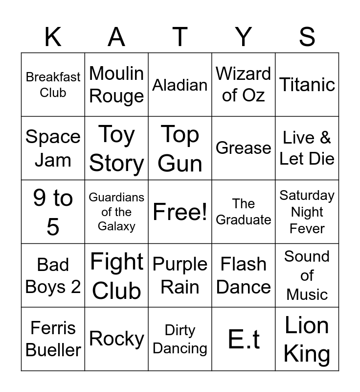 This bingo card has a free space and 32 words: E.t, Madagascar, Guardians of the Galaxy, Footloose, Bad Boys 2, Toy Story, Titanic, Sound of Music, Moulin Rouge, Shrek, Top Gun, Aladian, Back to the Future, Donnie Darko, The Graduate, Slum Dog Milionaire, Ferris Bueller, 9 to 5, Purple Rain, Fight Club, Flash Dance, 8 Mile, Saturday Night Fever, Rocky, Lion King, Wizard of Oz, Grease, Space Jam, Breakfast Club, Dirty Dancing, Fame and Live & Let Die.