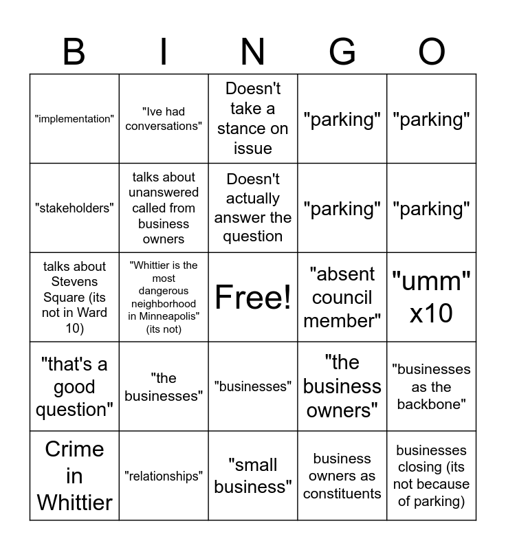 This bingo card has a free space and 24 words: "the businesses", "relationships", Doesn't actually answer the question, Crime in Whittier, "parking", "implementation", "stakeholders", "Ive had conversations", "absent council member", "businesses", "parking", talks about Stevens Square (its not in Ward 10), "the business owners", "businesses as the backbone", talks about unanswered called from business owners, business owners as constituents, "umm" x10, Doesn't take a stance on issue, "parking", "Whittier is the most dangerous neighborhood in Minneapolis" (its not), businesses closing (its not because of parking), "that's a good question", "parking" and "small business".