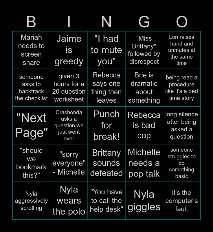 This bingo card has a free space and 24 words: "sorry everyone" - Michelle, Nyla wears the polo, Rebecca says one thing then leaves, Nyla aggressively scrolling, Lori raises hand and unmutes at the same time, Mariah needs to screen share, someone asks to backtrack the checklist, Jaime is greedy, Rebecca is bad cop, Brittany sounds defeated, Brie is dramatic about something, "Next Page", Michelle needs a pep talk, someone struggles to do something basic, given 3 hours for a 20 question worksheet, Nyla giggles, long silence after being asked a question, "I had to mute you", being read a procedure like it's a bed time story, Crashonda asks a question we just went over, it's the computer's fault, "should we bookmark this?", "Miss Brittany" followed by disrespect and "You have to call the help desk".