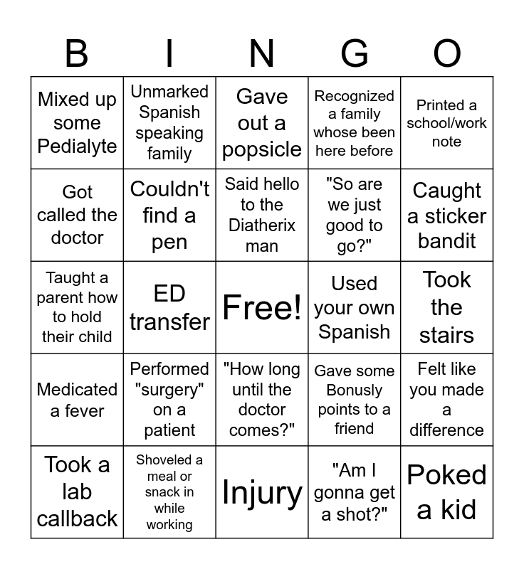 This bingo card has a free space and 24 words: Performed "surgery" on a patient, Shoveled a meal or snack in while working, Said hello to the Diatherix man, Took a lab callback, Printed a school/work note, Mixed up some Pedialyte, Got called the doctor, Unmarked Spanish speaking family, Used your own Spanish, "How long until the doctor comes?", "So are we just good to go?", Taught a parent how to hold their child, Gave some Bonusly points to a friend, Felt like you made a difference, Couldn't find a pen, "Am I gonna get a shot?", Took the stairs, Gave out a popsicle, Caught a sticker bandit, ED transfer, Poked a kid, Medicated a fever, Recognized a family whose been here before and Injury.
