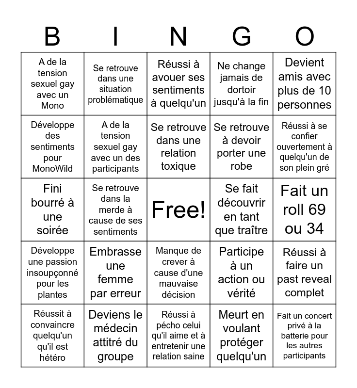 This bingo card has a free space and 24 words: Embrasse une femme par erreur, Deviens le médecin attitré du groupe, Se retrouve dans une relation toxique, Réussit à convaincre quelqu'un qu'il est hétéro, Devient amis avec plus de 10 personnes, A de la tension sexuel gay avec un Mono, Développe des sentiments pour MonoWild, Se retrouve dans une situation problématique, Se fait découvrir en tant que traître, Manque de crever à cause d'une mauvaise décision, Se retrouve à devoir porter une robe, Fini bourré à une soirée, Participe à un action ou vérité, Réussi à faire un past reveal complet, A de la tension sexuel gay avec un des participants, Meurt en voulant protéger quelqu'un, Fait un roll 69 ou 34, Réussi à avouer ses sentiments à quelqu'un, Réussi à se confier ouvertement à quelqu'un de son plein gré, Se retrouve dans la merde à cause de ses sentiments, Fait un concert privé à la batterie pour les autres participants, Développe une passion insoupçonné pour les plantes, Ne change jamais de dortoir jusqu'à la fin and Réussi à pécho celui qu'il aime et à entretenir une relation saine.