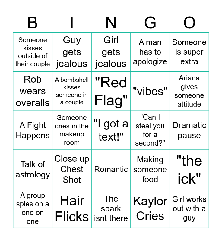 This bingo card has a free space and 27 words: Making someone food, "Crazy", "vibes", The spark isnt there, Rob wears overalls, Girl gets jealous, Guy gets jealous, Talk of astrology, "Can I steal you for a second?", "the ick", A Fight Happens, A man has to apologize, A group spies on a one on one, Hair Flicks, Ariana gives someone attitude, A couple goes to sleep angry, A bombshell kisses someone in a couple, "Red Flag", Close up Chest Shot, Someone kisses outside of their couple, Dramatic pause, Kaylor Cries, Someone cries in the makeup room, Girl works out with a guy, Romantic, Someone is super extra and Someone says something Bitchy.
