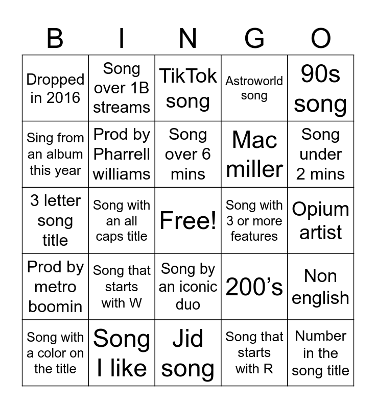 This bingo card has a free space and 24 words: Song that starts with W, Song I like, Song over 6 mins, Song with a color on the title, 90s song, Dropped in 2016, Sing from an album this year, Song over 1B streams, Song with 3 or more features, Song by an iconic duo, Mac miller, 3 letter song title, 200’s, Non english, Prod by Pharrell williams, Song that starts with R, Opium artist, TikTok song, Song under 2 mins, Song with an all caps title, Number in the song title, Prod by metro boomin, Astroworld song and Jid song.