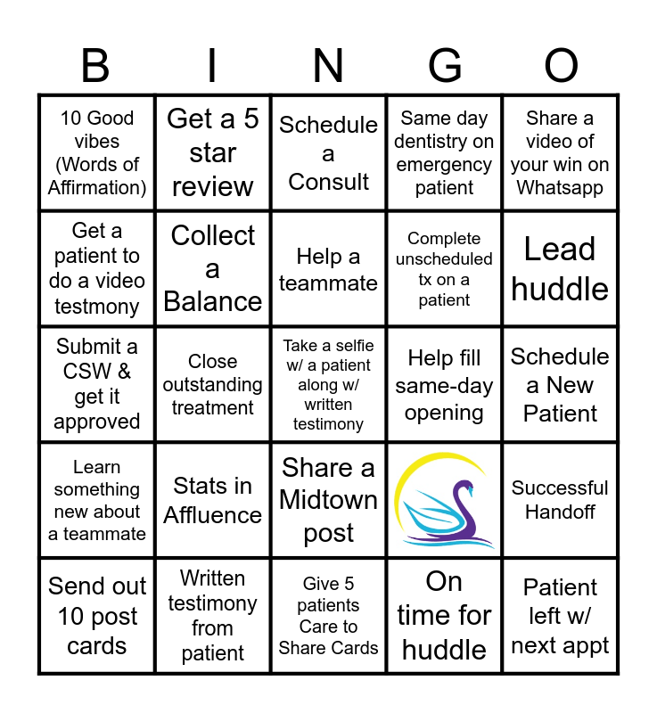 This bingo card has 1 images and 24 words: Stats in Affluence, Give 5 patients Care to Share Cards, Help a teammate, Send out 10 post cards, Share a video of your win on Whatsapp, 10 Good vibes (Words of Affirmation), Get a patient to do a video testmony, Get a 5 star review, Help fill same-day opening, Share a Midtown post, Complete unscheduled tx on a patient, Submit a CSW & get it approved, Successful Handoff, Collect a Balance, Patient left w/ next appt, Schedule a New Patient, Schedule a Consult, Lead huddle, Close outstanding treatment, Take a selfie w/ a patient along w/ written testimony, Written testimony from patient, Learn something new about a teammate, Same day dentistry on emergency patient and On time for huddle.