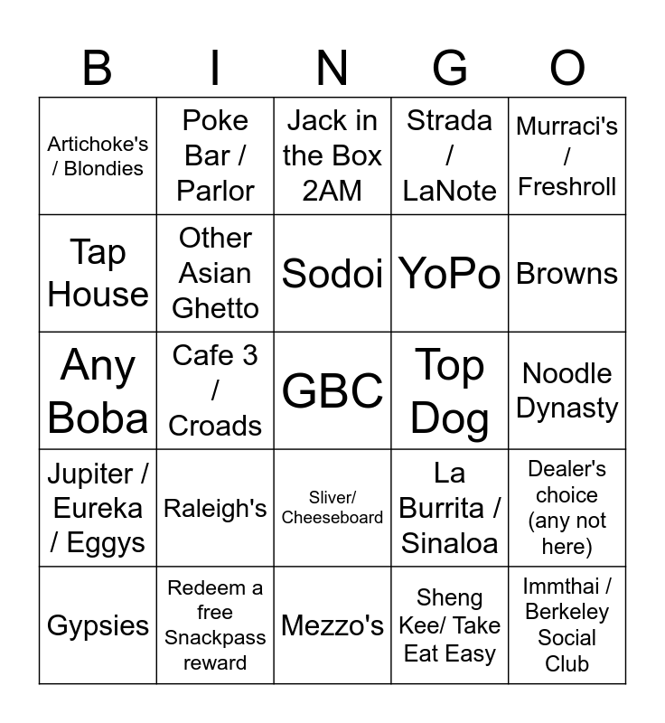 This bingo card has 25 words: Raleigh's, Mezzo's, Sodoi, Gypsies, Murraci's / Freshroll, Artichoke's / Blondies, Tap House, Poke Bar / Parlor, Top Dog, Sliver/ Cheeseboard, YoPo, Any Boba, La Burrita / Sinaloa, Dealer's choice (any not here), Other Asian Ghetto, Immthai / Berkeley Social Club, Noodle Dynasty, Jack in the Box 2AM, Browns, Cafe 3 / Croads, GBC, Redeem a free Snackpass reward, Jupiter / Eureka / Eggys, Strada / LaNote and Sheng Kee/ Take Eat Easy.