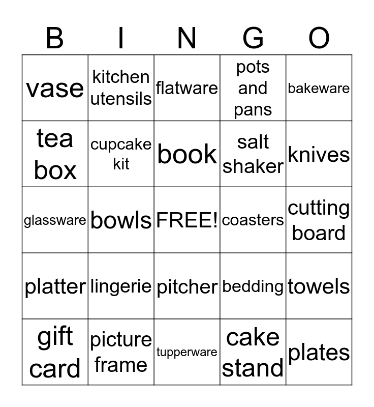 This bingo card has a free space and 24 words: lingerie, picture frame, book, gift card, bakeware, vase, tea box, kitchen utensils, coasters, pitcher, salt shaker, glassware, bedding, towels, cupcake kit, cake stand, cutting board, flatware, knives, bowls, plates, platter, pots and pans and tupperware.