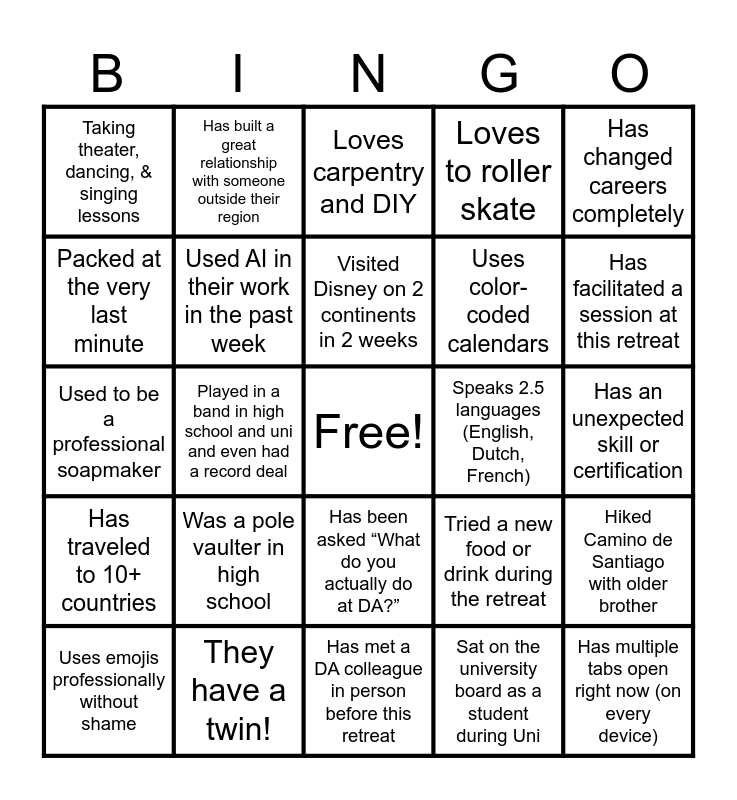 This bingo card has a free space and 24 words: Was a pole vaulter in high school, They have a twin!, Visited Disney on 2 continents in 2 weeks, Uses emojis professionally without shame, Has changed careers completely, Taking theater, dancing, & singing lessons, Packed at the very last minute, Has built a great relationship with someone outside their region, Speaks 2.5 languages (English, Dutch, French), Has been asked “What do you actually do at DA?”, Uses color-coded calendars, Used to be a professional soapmaker, Tried a new food or drink during the retreat, Hiked Camino de Santiago with older brother, Used AI in their work in the past week, Sat on the university board as a student during Uni, Has an unexpected skill or certification, Loves carpentry and DIY, Has facilitated a session at this retreat, Played in a band in high school and uni and even had a record deal, Has multiple tabs open right now (on every device), Has traveled to 10+ countries, Loves to roller skate and Has met a DA colleague in person before this retreat.
