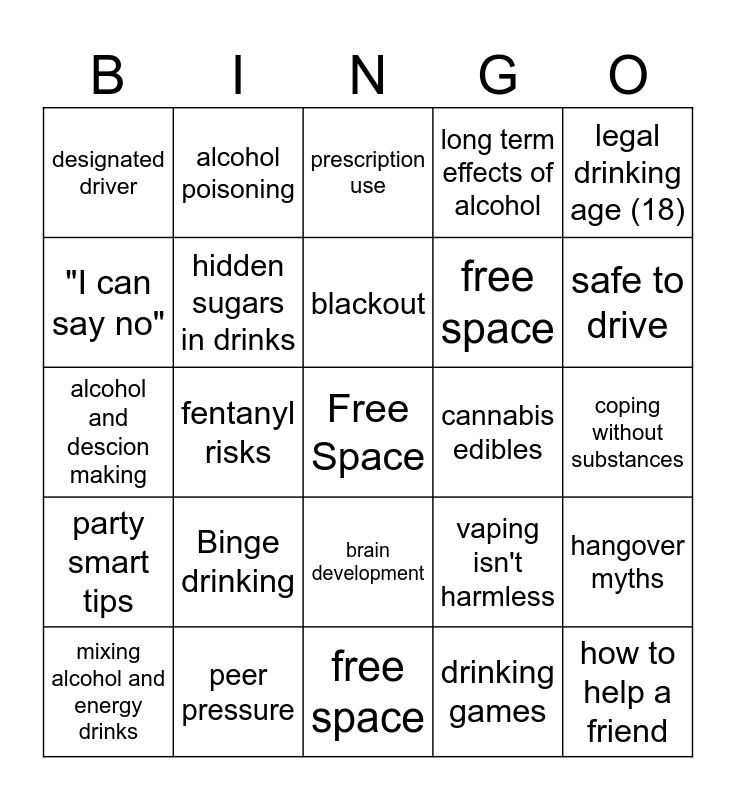 This bingo card has a free space and 24 words: Binge drinking, peer pressure, blackout, mixing alcohol and energy drinks, legal drinking age (18), designated driver, "I can say no", alcohol poisoning, cannabis edibles, brain development, free space, alcohol and descion making, vaping isn't harmless, hangover myths, hidden sugars in drinks, drinking games, coping without substances, prescription use, safe to drive, fentanyl risks, how to help a friend, party smart tips, long term effects of alcohol and free space.